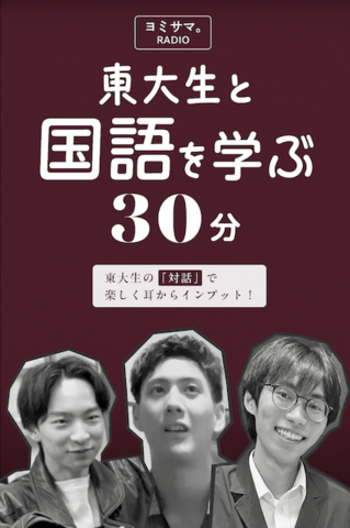 「東大生と国語を学ぶ30分」と題し、現役ヨミサマ。講師の3人があなたの脳を刺激するトークをお届け。聴いているだけで国語力が自然と伸びていくこと間違いナシです。