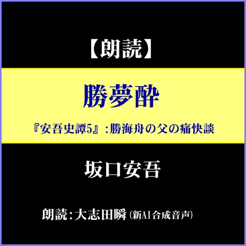 幕末の江戸城の無血開城の幕府側のキーパーソンとして知られる勝海舟の父親である勝夢酔の痛快な生き方を描く。 ※朗読音声は、2022年のAI技術に基づく最新合成音声です(男声)。