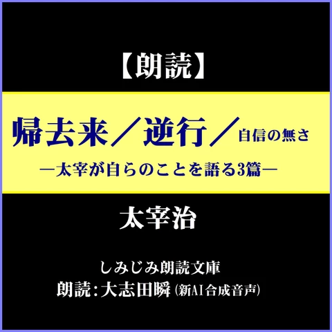 太宰の故郷、津軽を想う気持ちには切々たるものがある。「思い出」「故郷」「兄たち」から「津軽」に至るまで、それぞれの作品の中で描かれているが、「帰去来」もその一つである。津軽から東京に出てきた以降、芸妓上がりの女性との同棲、共産党の地下活動、心中未遂、モルヒネ中毒などの荒れた東京帝大時代を経て、作品集の出版、結婚、作家としての独り立ちをした後の安定した時期(1943年)に発表されている。津島家を支える長兄の怒りを買い、故郷からは義絶状態だったが、母の健康状態が不安となっていたため、ずっと内々で面倒を見てもらってきた北さん、中畑さんと実家の人々との阿吽の呼吸で、急遽帰郷を果たすことになった。10年ぶりに故郷の土を踏んだ。長兄不在の合間を見計らっての帰郷だったが、墓参り、懐かしい母と叔母、祖母、次兄、姉らとの再会を無事果たすことができた。短時間の滞在だったが、皆があたたかく迎えてくれた・・・。これで、母危篤の際に実家を訪ねる素地もできた(実際そうなった時の様子は「故郷」に描かれている)。「逆行」は4つの掌編から成る(1935年発表)。そのうちの「盗賊」は芥川賞候補となった当時としては異色の作品であった。「自信の無さ」は、朝日新聞の文芸批評で新進作家の作品の自信の無さを指摘され、一例に太宰の作品が挙げられたことへの静かな抗弁。結果的に太宰の指摘は当たることになる(1940年のもの)。※朗読音声は、2022年のAI技術に基づく最新合成音声です(男声)。制作:しみじみ朗読文庫